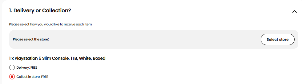 Once you've reached the basket page and clicked Proceed to Checkout, you can select between having your item(s) delivered to you, or to collect it from store. Click the "Collect in Store" button and then the "SELECT STORE" button, where you will be asked to search for a location.